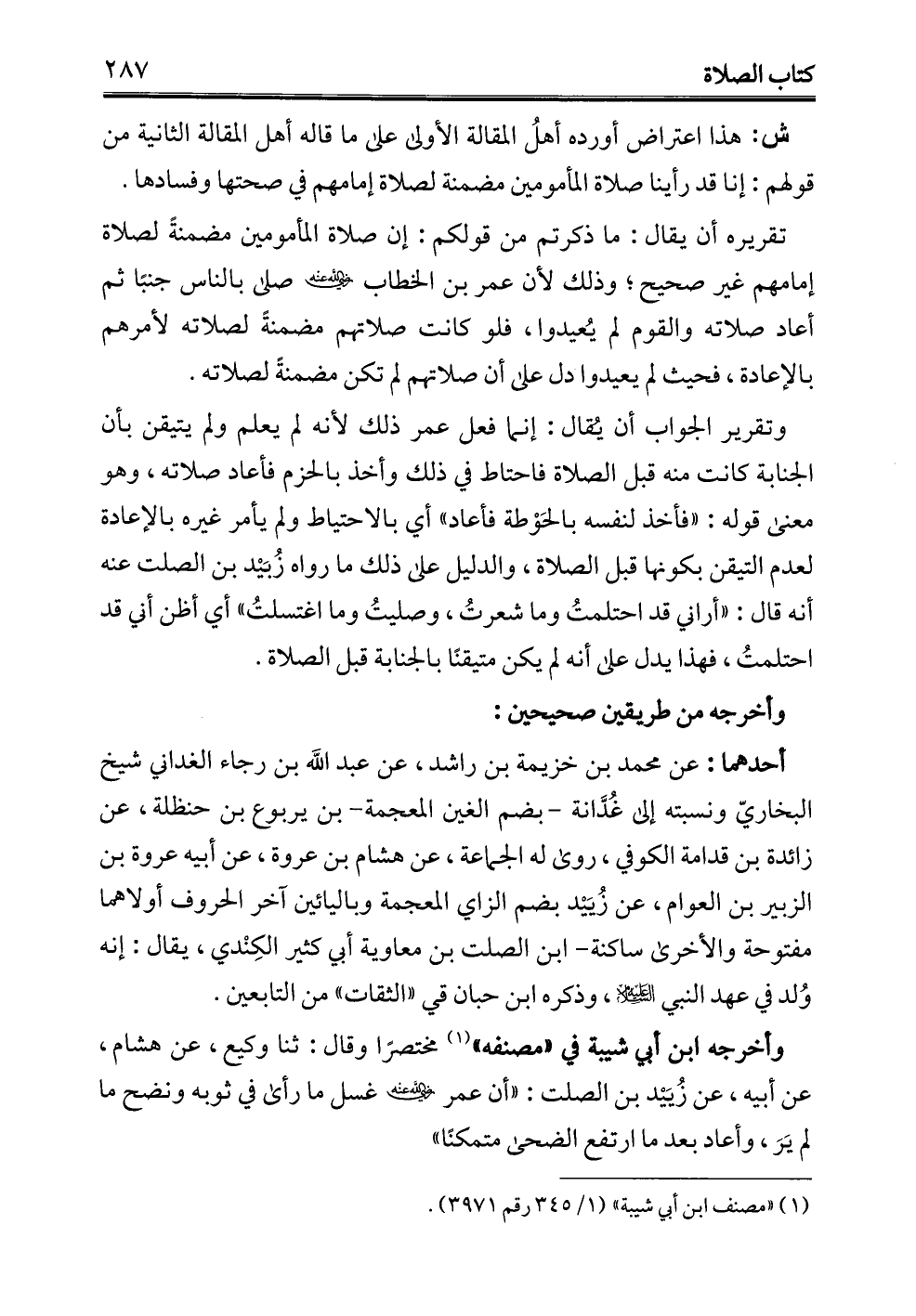 تقريره أن يقال: ما ذكرتم من قولكم: إن صلاة المأمومين مضمنةً لصلاة إمامهم غير صحيح؛ وذلك لأن عمر بن الخطاب - رضي الله عنه - صلى بالناس جنبًا ثم أعاد صلاته والقوم لم يُعيدوا، فلو كانت صلاتهم مضمنةً لصلاته لأمرهم بالإعادة، فحيث لم يعيدوا دل على أن صلاتهم لم تكن مضمنةً لصلاته.