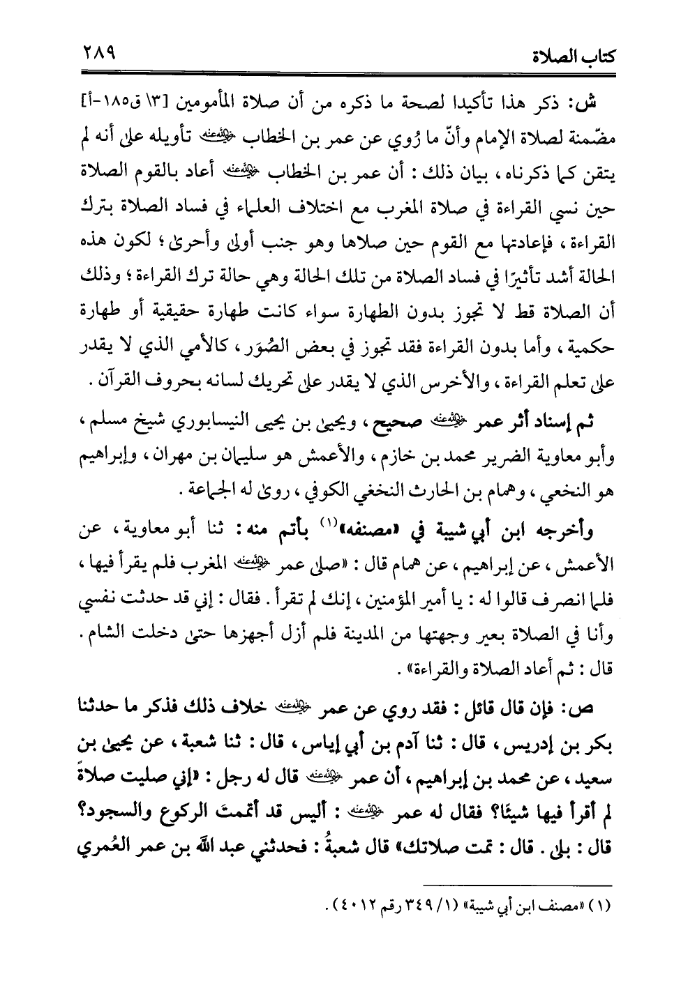 وأخرجه ابن أبي شيبة في "مصنفه" (¬1) بأتم منه: ثنا أبو معاوية، عن الأعمش، عن إبراهيم، عن همام قال: "صلى عمر- رضي الله عنه - المغرب فلم يقرأ فيها، فلما انصرف قالوا له: يا أمير المؤمنين، إنك لم تقرأ. فقال: إني قد حدثت نفسي وأنا في الصلاة بعير وجهتها من المدينة فلم أزل أجهزها حتى دخلت الشام. قال: ثم أعاد الصلاة والقراءة".