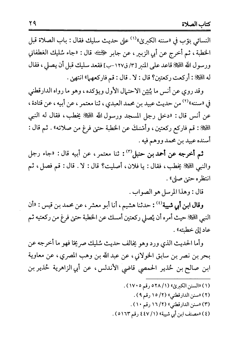وأما الحديث الذي ورد وهو يخالف حديث سُليك صريحًا فهو ما أخرجه عن بحر بن نصر بن سابق الخولاني، عن عبد الله بن وهب المصري، عن معاوية ابن صالح بن حُدَير الحمصي قاضي الأندلس، عن أبي الزاهرية حُدَير بن