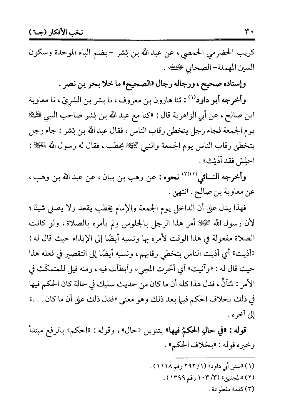 وأخرجه أبو داود (¬1): ثنا هارون بن معروف، نا بشر بن السَّرِيّ، نا معاوية ابن صالح، عن أبي الزاهرية قال: "كنا مع عبد الله بن بُسْر صاحب النبي - عليه السلام - يوم الجمعة فجاء رجل يتخطى رقاب الناس، فقال عبد الله بن بُسْر: جاء رجل يتخطى رقاب الناس يوم الجمعة والنبي - عليه السلام - يخطب، فقال له رسول الله - عليه السلام -: اجلِسْ فقد آذَيْتَ".
