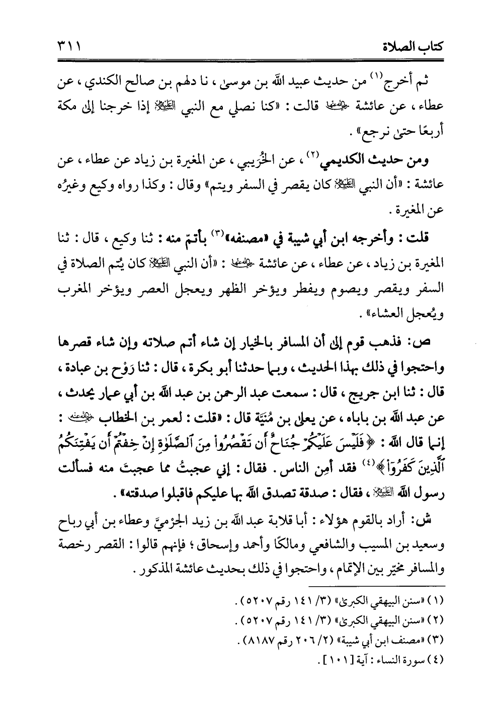 ثم أخرج (¬1) من حديث عبيد الله بن موسى، نا دلهم بن صالح الكندي، عن عطاء، عن عائشة - رضي الله عنها - قالت: "كنا نصلي مع النبي - عليه السلام - إذا خرجنا إلى مكة أربعًا حتى نرجع".