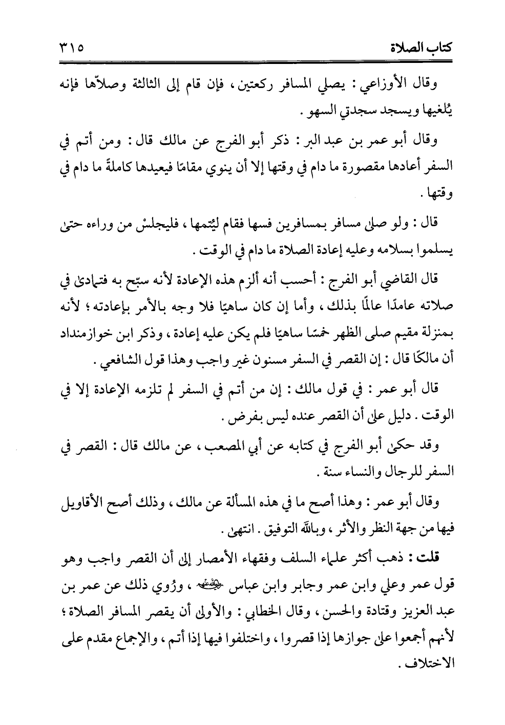 وقد حكى أبو الفرج في كتابه عن أبي المصعب، عن مالك قال: القصر في السفر للرجال والنساء سنة.