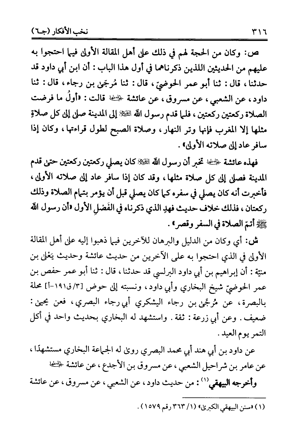 ص: وكان من الحجة لهم في ذلك على أهل المقالة الأولى فيما احتجوا به عليهم من الحديثين اللذين ذكرناهما في أول هذا الباب: أن ابن أبي داود قد حدثنا، قال: ثنا أبو عمر الحوضيّ، قال: ثنا مُرجّى بن رجاء، قال: ثنا داود، عن الشعبي، عن مسروق، عن عائشة - رضي الله عنه - قالت: "أولُ ما فرضت الصلاة ركعتين ركعتين، فلما قدم رسول الله - عليه السلام - إلى المدينة صلى إلى كل صلاةٍ مثلها إلا المغرب فإنها وتر النهار، وصلاة الصبح لطول قراءتها، وكان إذا سافر عاد إلى صلاته الأولى".