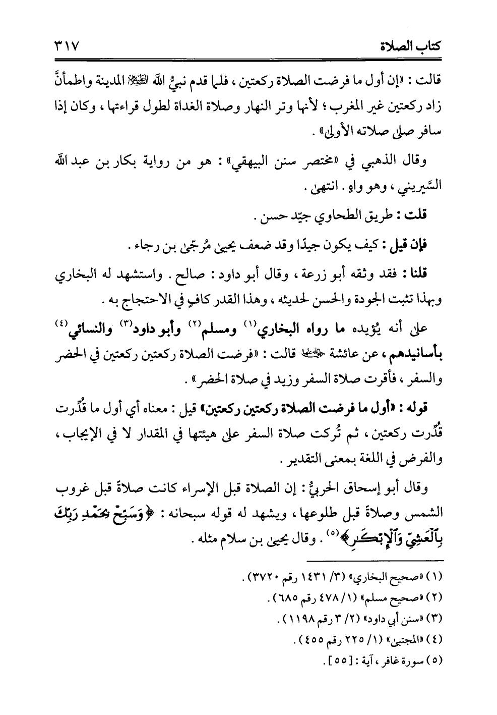 قالت: "إن أول ما فرضت الصلاة ركعتين، فلما قدم نبيُّ الله - عليه السلام - المدينة واطمأنَّ زاد ركعتين غير المغرب؛ لأنها وتر النهار وصلاة الغداة لطول قراءتها، وكان إذا سافر صلى صلاته الأولى".