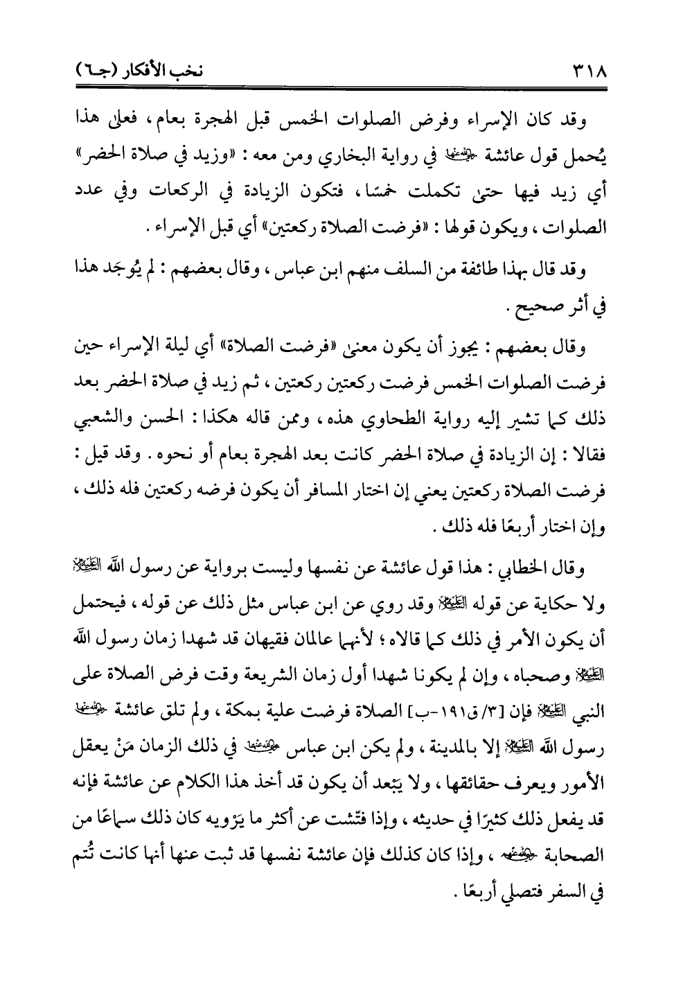 وقد كان الإسراء وفرض الصلوات الخمس قبل الهجرة بعام، فعلى هذا يُحمل قول عائشة - رضي الله عنها - في رواية البخاري ومن معه: "وزيد في صلاة الحضر" أي زيد فيها حتى تكملت خمسًا، فتكون الزيادة في الركعات وفي عدد الصلوات، ويكون قولها: "فرضت الصلاة ركعتين" أي قبل الإسراء.