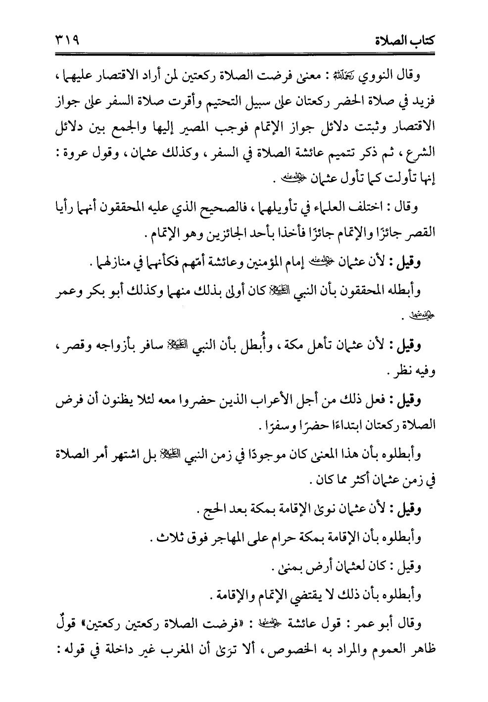 وقال النووي -رحمه الله-: معنى فرضت الصلاة ركعتين لمن أراد الاقتصار عليهما، فزيد في صلاة الحضر ركعتان على سبيل التحتيم وأقرت صلاة السفر على جواز الاقتصار وثبتت دلائل جواز الإتمام فوجب المصير إليها والجمع بين دلائل الشرع، ثم ذكر تتميم عائشة الصلاة في السفر، وكذلك عثمان، وقول عروة: إنها تأولت كما تأول عثمان - رضي الله عنه -.