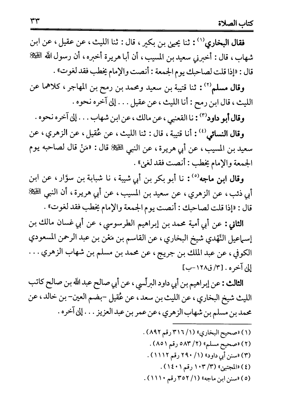 فقال البخاري (¬1): ثنا يحيى بن بكير، قال: ثنا الليث، عن عقيل، عن ابن شهاب، قال: أخبرني سعيد بن المسيب، أن أبا هريرة أخبره، أن رسول الله - عليه السلام - قال: "إذا قلت لصاحبك يوم الجمعة: أنصت والإمام يخطب فقد لغوت".