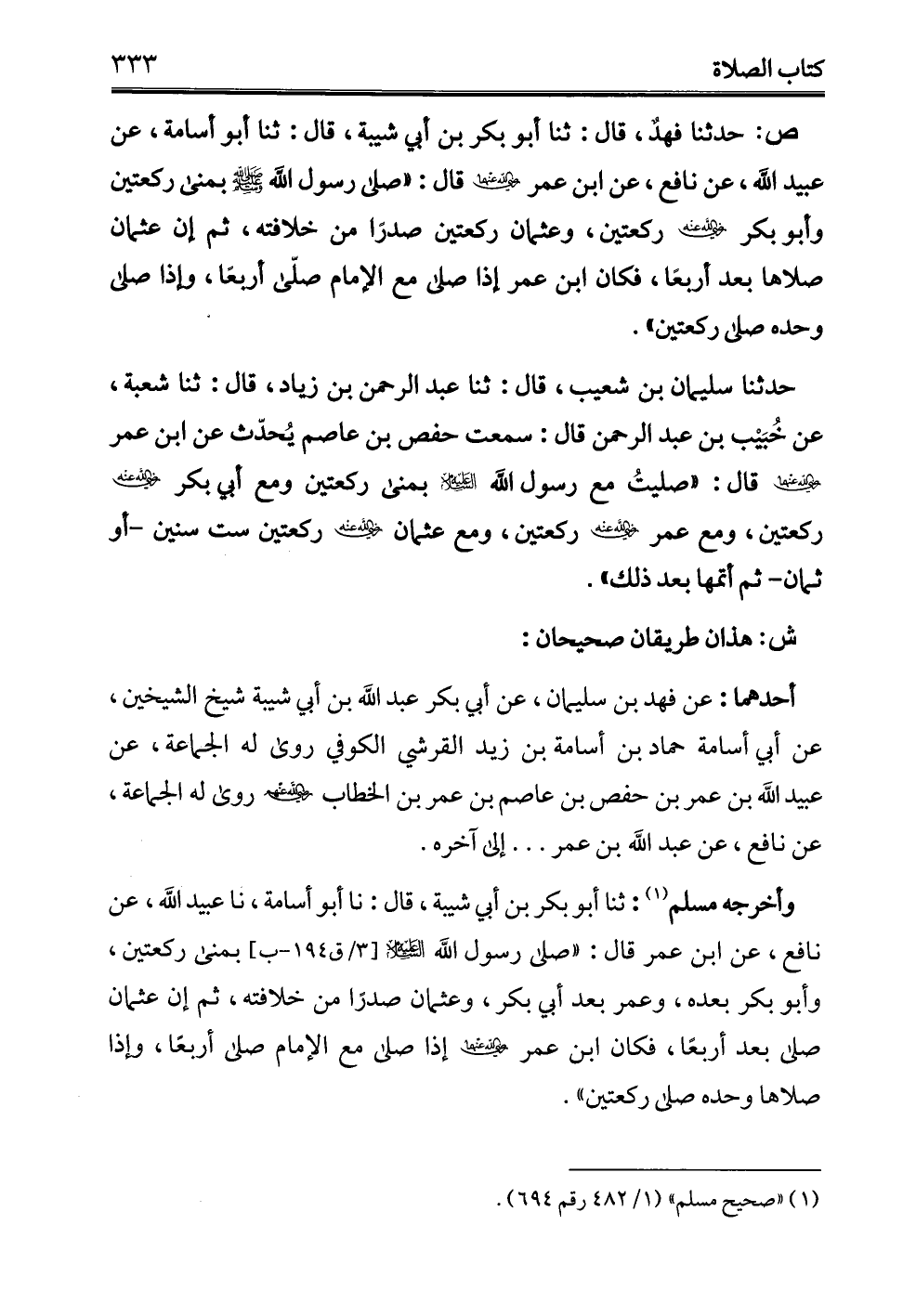 أحدهما: عن فهد بن سليمان، عن أبي بكر عبد الله بن أبي شيبة شيخ الشيخين، عن أبي أسامة حماد بن أسامة بن زيد القرشي الكوفي روى له الجماعة، عن عبيد الله بن عمر بن حفص بن عاصم بن عمر بن الخطاب روى له الجماعة، عن نافع، عن عبد الله بن عمر ... إلى آخره.