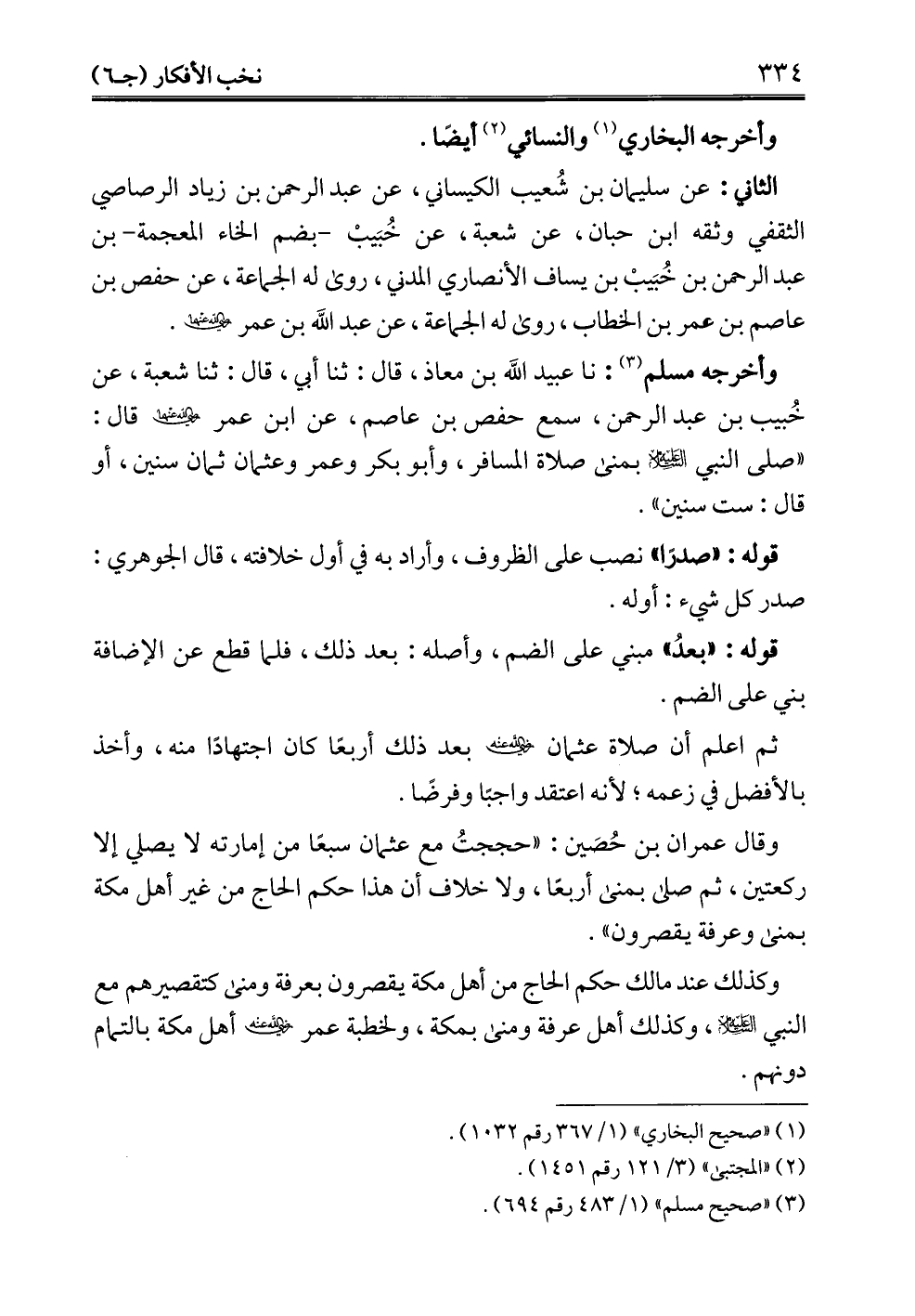 وأخرجه مسلم (¬3): نا عبيد الله بن معاذ، قال: ثنا أبي، قال: ثنا شعبة، عن خُبيب بن عبد الرحمن، سمع حفص بن عاصم، عن ابن عمر - رضي الله عنهما - قال: "صلى النبي - عليه السلام - بمنى صلاة المسافر، وأبو بكر وعمر وعثمان ثمان سنين، أو قال: ست سنين".
