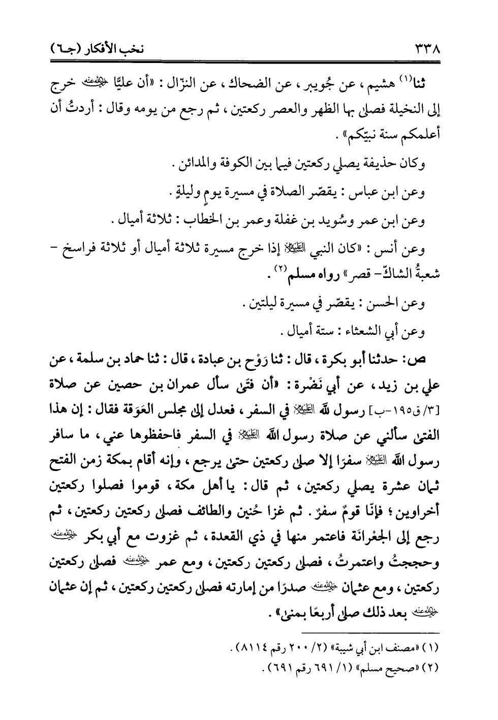 ثنا (¬1) هشيم، عن جُويبر، عن الضحاك، عن النزّال: "أن عليًّا - رضي الله عنه - خرج إلى النخيلة فصلى بها الظهر والعصر ركعتين، ثم رجع من يومه وقال: أردتُ أن أعلمكم سنة نبيّكم".