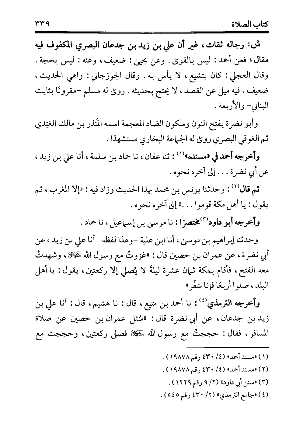 وأخرجه الترمدي (¬4): نا أحمد بن مَنيع، قال: نا هشيم، قال: أنا علي بن زيد بن جدعان، عن أبي نضرة قال: "سُئل عمران بن حصين عن صلاة المسافر، فقال: حججتُ مع رسول الله - عليه السلام - فصلى ركعتين، وحججت مع