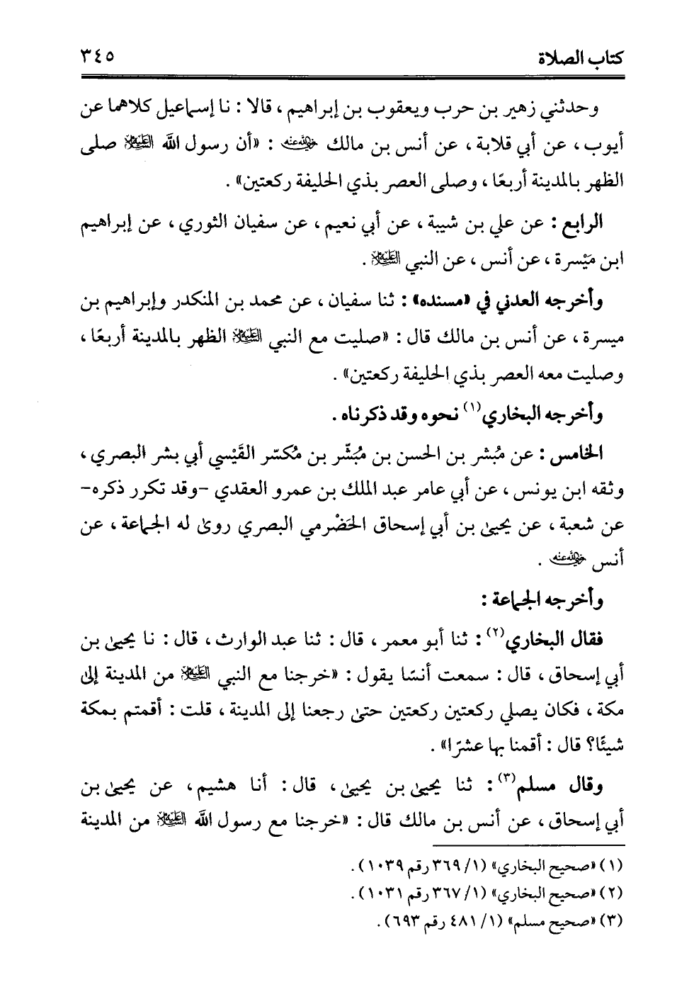 وحدثني زهير بن حرب ويعقوب بن إبراهيم، قالا: نا إسماعيل كلاهما عن أيوب، عن أبي قلابة، عن أنس بن مالك - رضي الله عنه -: "أن رسول الله - عليه السلام - صلى الظهر بالمدينة أربعًا، وصلى العصر بذي الحليفة ركعتين".