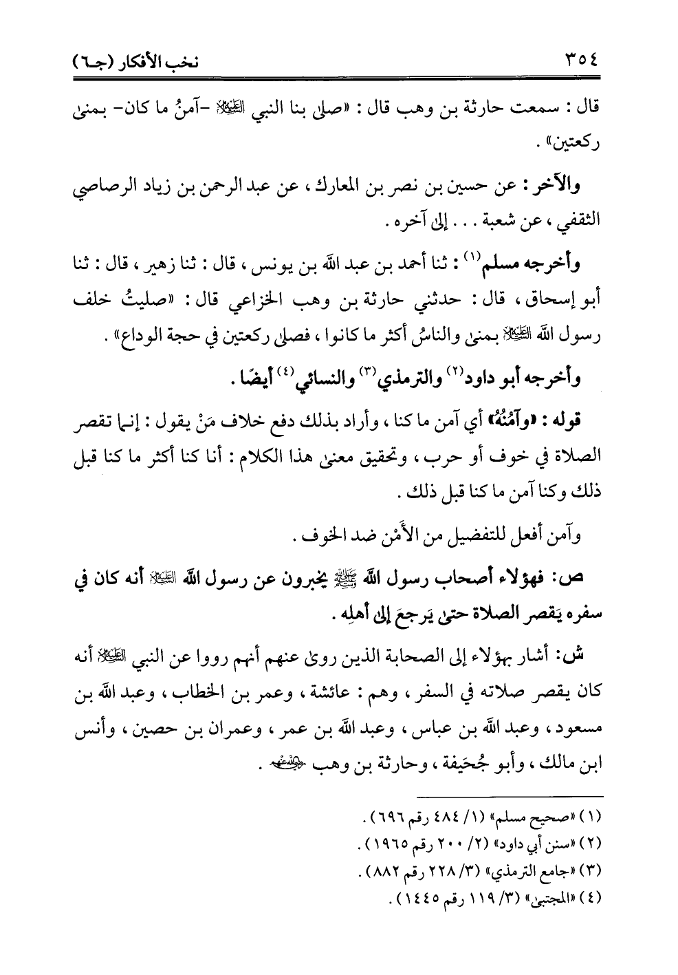 قال: سمعت حارثة بن وهب قال: "صلى بنا النبي - عليه السلام -آمنُ ما كان- بمنى ركعتين".