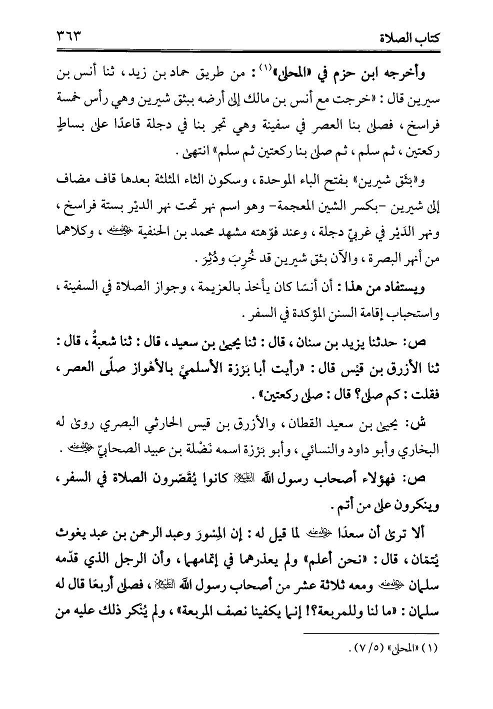 وأخرجه ابن حزم في "المحلى" (¬1): من طريق حماد بن زيد، ثنا أنس بن سيرين قال: "خرجت مع أنس بن مالك إلى أرضه ببثق شيرين وهي رأس خمسة فراسخ، فصلى بنا العصر في سفينة وهي تجر بنا في دجلة قاعدًا على بساطٍ ركعتين، ثم سلم، ثم صلى بنا ركعتين ثم سلم" انتهى.