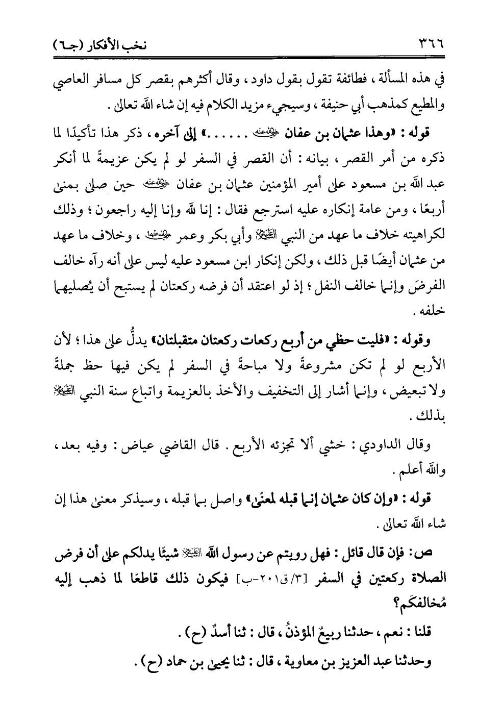 قوله: "وهذا عثمان بن عفان - رضي الله عنه - ...... " إلى آخره، ذكر هذا تأكيدًا لما ذكره من أمر القصر، بيانه: أن القصر في السفر لو لم يكن عزيمةً لما أنكر عبد الله بن مسعود على أمير المؤمنين عثمان بن عفان - رضي الله عنه - حين صلى بمنى أربعًا، ومن عامة إنكاره عليه استرجع فقال: إنا لله وإنا إليه راجعون؛ وذلك لكراهيته خلاف ما عهد من النبي - عليه السلام - وأبي بكر وعمر - رضي الله عنهما -، وخلاف ما عهد من عثمان أيضًا قبل ذلك، ولكن إنكار ابن مسعود عليه ليس على أنه رآه خالف الفرضَ وإنما خالف النفل؛ إذ لو اعتقد أن فرضه ركعتان لم يستبح أن يصليهما خلفه.