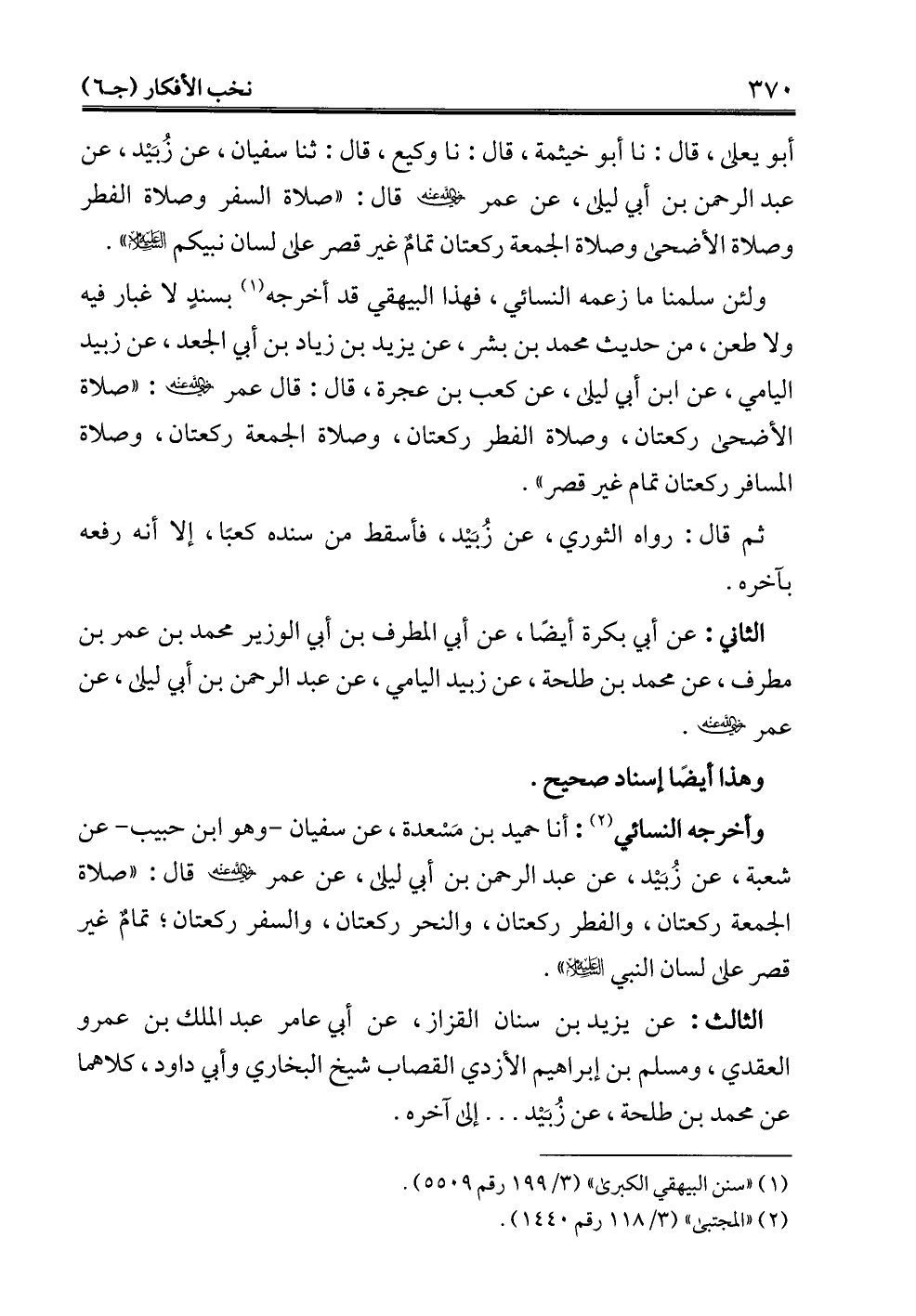 ولئن سلمنا ما زعمه النسائي، فهذا البيهقي قد أخرجه (¬1) بسندٍ لا غبار فيه ولا طعن، من حديث محمد بن بشر، عن يزيد بن زياد بن أبي الجعد، عن زبيد اليامي، عن ابن أبي ليلى، عن كعب بن عجرة، قال: قال عمر - رضي الله عنه -: "صلاة الأضحى ركعتان، وصلاة الفطر ركعتان، وصلاة الجمعة ركعتان، وصلاة المسافر ركعتان تمام غير قصر".