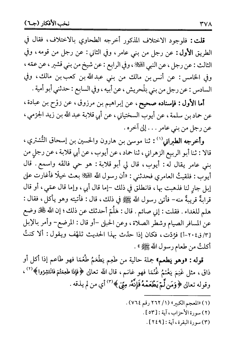 وأخرجه الطبراني (¬1): ثنا موسى بن هارون والحسن بن إسحاق التُّسْري، قالا: ثنا أبو الربيع الزهراني، ثنا حماد، عن أيوب، عن أبي قلابة، عن رجل من بني عامر يقال له: أيوب، قال لي أبو قلابة: هو حي فالقَه واسمع. قال أيوب: فلقيتُ العامري فحدثني: "أن رسول الله - عليه السلام - بعث خيلًا فأغارت على إبل جارٍ لنا فذهبت بها، فانطلق في ذلك -إما قال أبي، وإما قال عمّي، أو قال قرابةٌ قريبةٌ منه- فأتى رسول الله - عليه السلام - في ذلك، قال: فأتيته وهو يأكل، فقال: هلم للغداء. فقلت: إني صائم. قال: هَلُمّ أحدثك عن ذلك؛ إن الله -عز وجل- وضع عن المسافر الصيام وشطر الصلاة، وعن الحبلى -أو قال: المرضع- وأمر بالإبل فرُدّت، فكان إذا حدّث بهذا الحديث تَلهَّف ويقول: ألا كنتُ أكلتُ من طعام رسول الله - صلى الله عليه وسلم -.