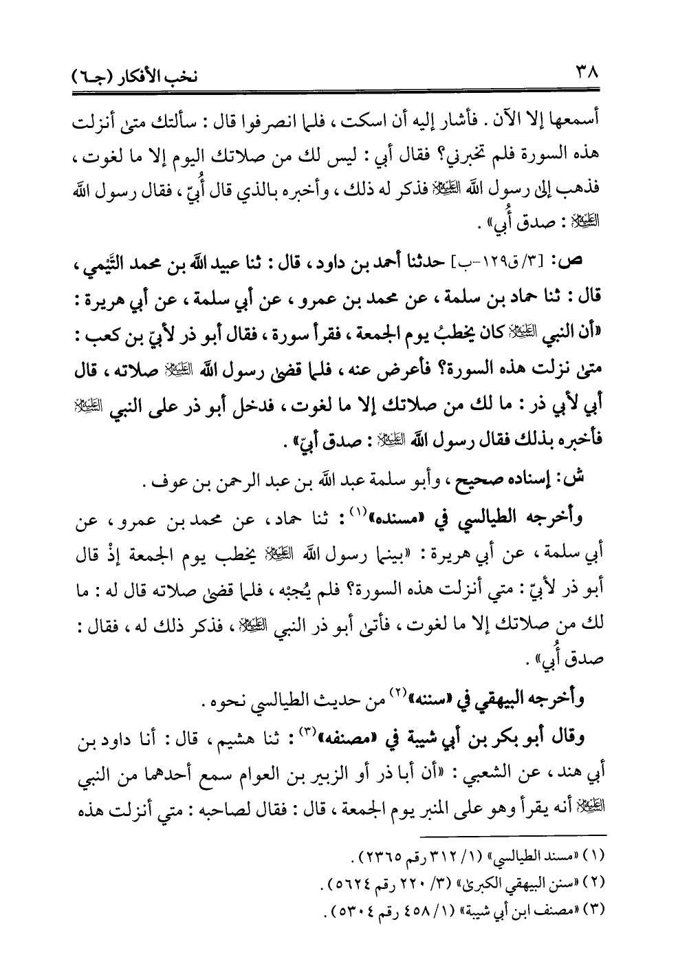 ص: حدثنا أحمد بن داود، قال: ثنا عبيد الله بن محمَّد التَّيْمي، قال: ثنا حماد بن سلمة، عن محمَّد بن عمرو، عن أبي سلمة، عن أبي هريرة: "أن النبي - عليه السلام - كان يخطبُ يوم الجمعة، فقرأ سورة، فقال أبو ذر لأبيّ بن كعب: متى نزلت هذه السورة؟ فأعرض عنه، فلما قضى رسول الله - عليه السلام - صلاته، قال أبي لأبي ذر: ما لك من صلاتك إلا ما لغوت، فدخل أبو ذر على النبي - عليه السلام - فأخبره بذلك فقال رسول الله - عليه السلام -: صدق أبيّ".