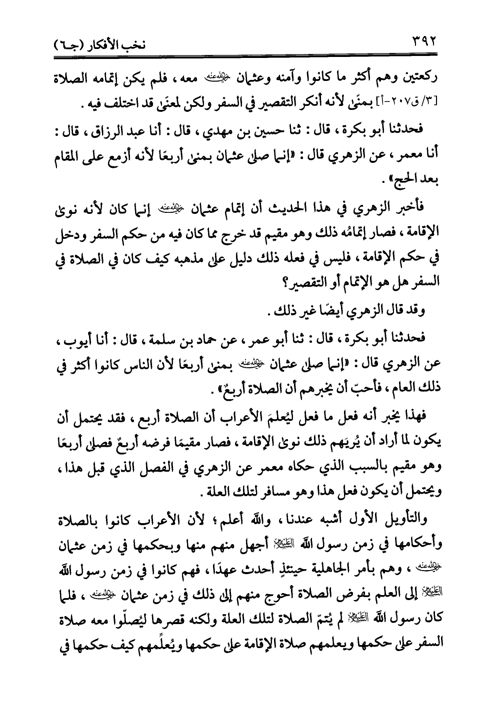 فحدثنا أبو بكرة، قال: ثنا أبو عمر، عن حماد بن سلمة، قال: أنا أيوب، عن الزهري قال: "إنما صلى عثمان - رضي الله عنه - بمنى أربعًا لأن الناس كانوا أكثر في ذلك العام، فأحبّ أن يخبرهم أن الصلاة أربعٌ".