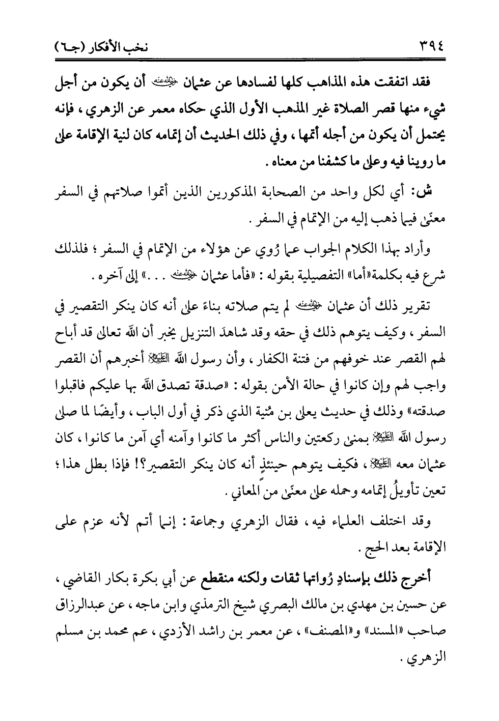 فقد اتفقت هذه المذاهب كلها لفسادها عن عثمان - رضي الله عنه - أن يكون من أجل شيء منها قصر الصلاة غير المذهب الأول الذي حكاه معمر عن الزهري، فإنه يحتمل أن يكون من أجله أتمها، وفي ذلك الحديث أن إتمامه كان لنية الإقامة على ما روينا فيه وعلى ما كشفنا من معناه.
