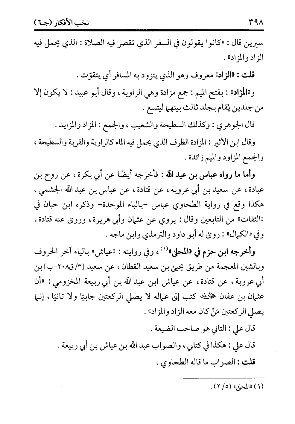 وأخرجه ابن حزم في "المحلى" (¬1)، وفي روايته: "عياش" بالياء آخر الحروف وبالشين المعجمة من طريق يحيى بن سعيد القطان، عن سعيد بن أبي عروبة، عن قتادة، عن عياش ابن عبد الله بن أبي ربيعة المخزومي: "أن عثمان بن عفان - رضي الله عنه - كتب إلى عماله لا يصلي الركعتين جابيًا ولا تانيًا، إنما يصلي الركعتين مَنْ كان معه الزاد والمزاد".
