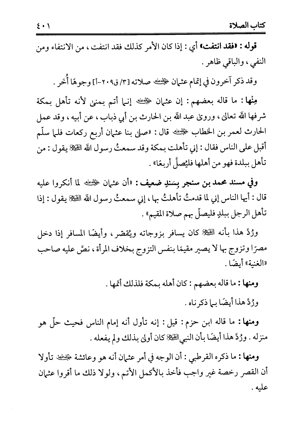 مِنْها: ما قاله بعضهم: إن عثمان - رضي الله عنه - إنما أتم بمنى لأنه تأهل بمكة شرفها الله تعالى، وروى عبد الله بن الحارث بن أبي ذباب، عن أبيه، وقد عمل الحارث لعمر بن الخطاب - رضي الله عنه - قال: "صلى بنا عثمان أربع ركعات فلما سلّم أقبل على الناس فقال: إني تأهلت بمكة وقد سمعتُ رسول الله - عليه السلام - يقول: من تأهل ببلدة فهو من أهلها فليُصلَّ أربعًا".