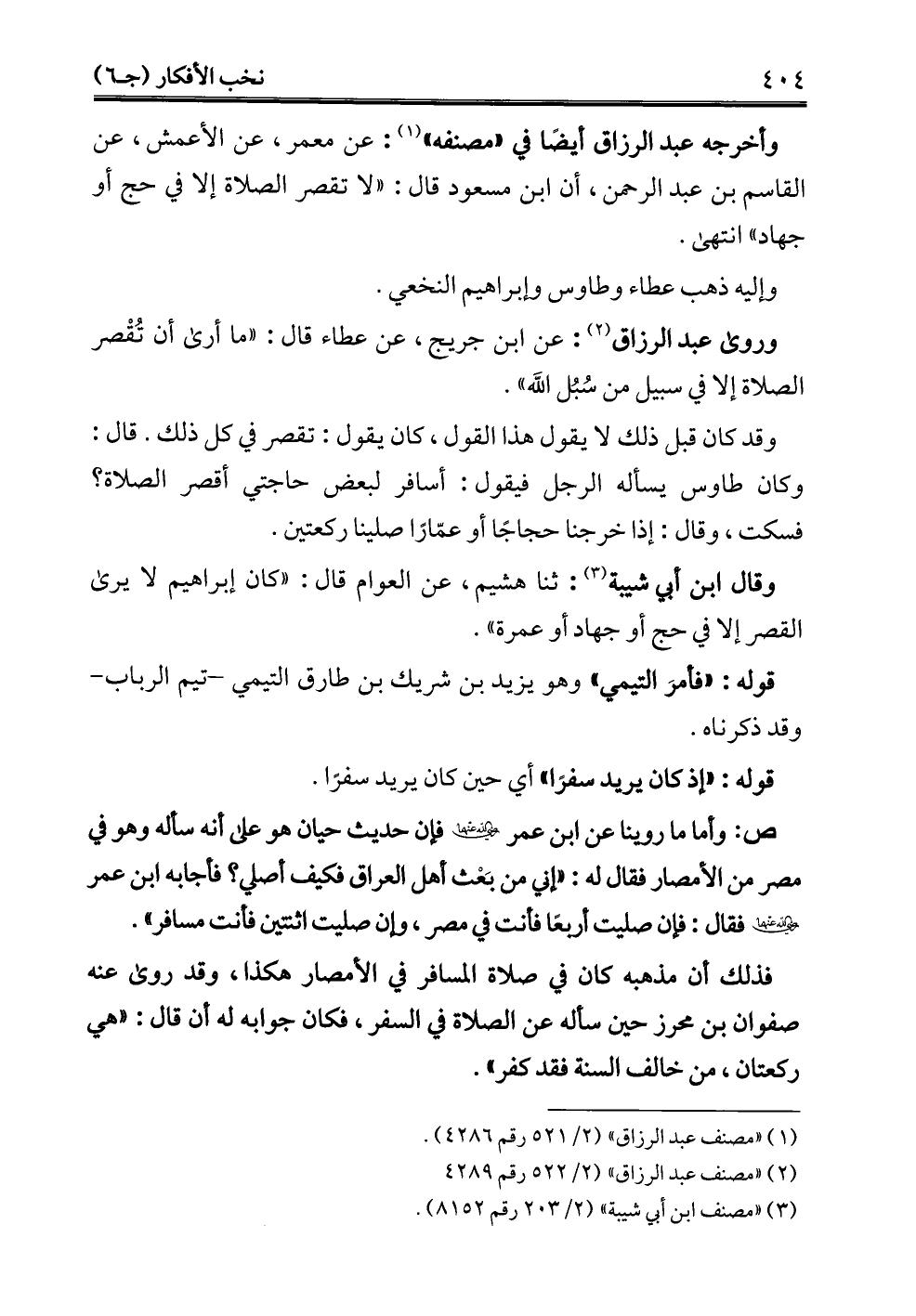 وأخرجه عبد الرزاق أيضًا في "مصنفه" (¬1): عن معمر، عن الأعمش، عن القاسم بن عبد الرحمن، أن ابن مسعود قال: "لا تقصر الصلاة إلا في حج أو جهاد" انتهى.