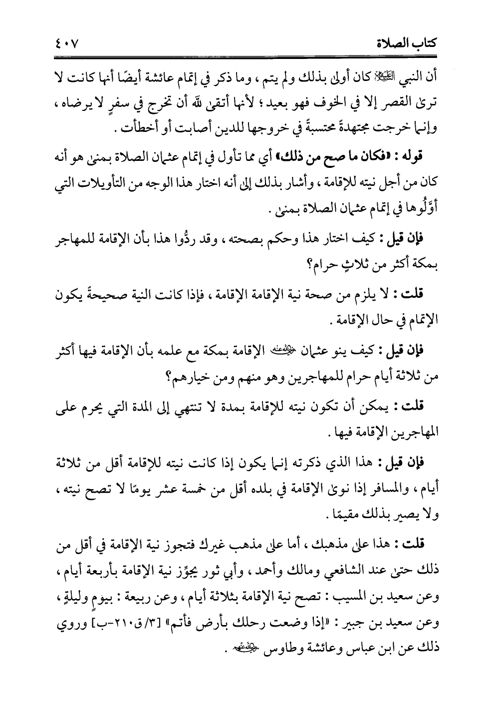 أن النبي - عليه السلام - كان أولى بذلك ولم يتم، وما ذكر في إتمام عائشة أيضًا أنها كانت لا ترى القصر إلا في الخوف فهو بعيدة؛ لأنها أتقى لله أن تخرج في سفرٍ لا يرضاه، وإنما خرجت مجتهدةً محتسبةً في خروجها للدين أصابت أو أخطأت.