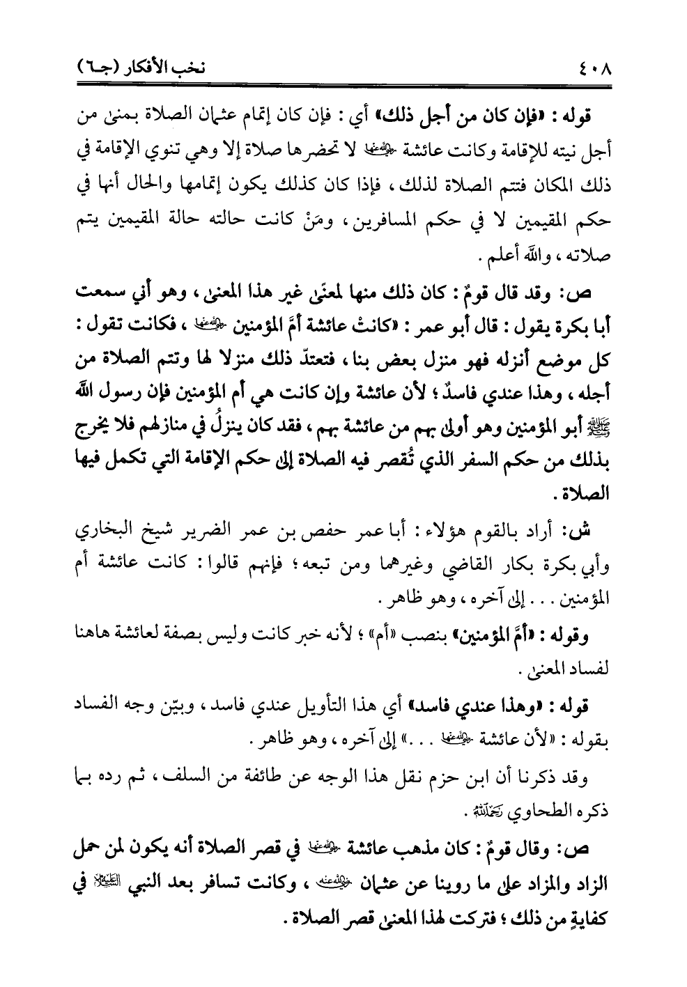 ص: وقد قال قومٌ: كان ذلك منها لمعنًى غير هذا المعنى، وهو أني سمعت أبا بكرة يقول: قال أبو عمر: "كانتْ عائشة أمَّ المؤمنين - رضي الله عنها -، فكانت تقول: كل موضع أنزله فهو منزل بعض بنا، فتعتدّ ذلك منزلا لها وتتم الصلاة من أجله، وهذا عندي فاسد؛ لأن عائشة وإن كانت هي أم المؤمنين فإن رسول الله - صلى الله عليه وسلم - أبو المؤمنين وهو أولى بهم من عائشة بهم، فقد كان ينزلُ في منازلهم فلا يخرج بذلك من حكم السفر الذي تُقصر فيه الصلاة إلى حكم الإقامة التي تكمل فيها الصلاة.