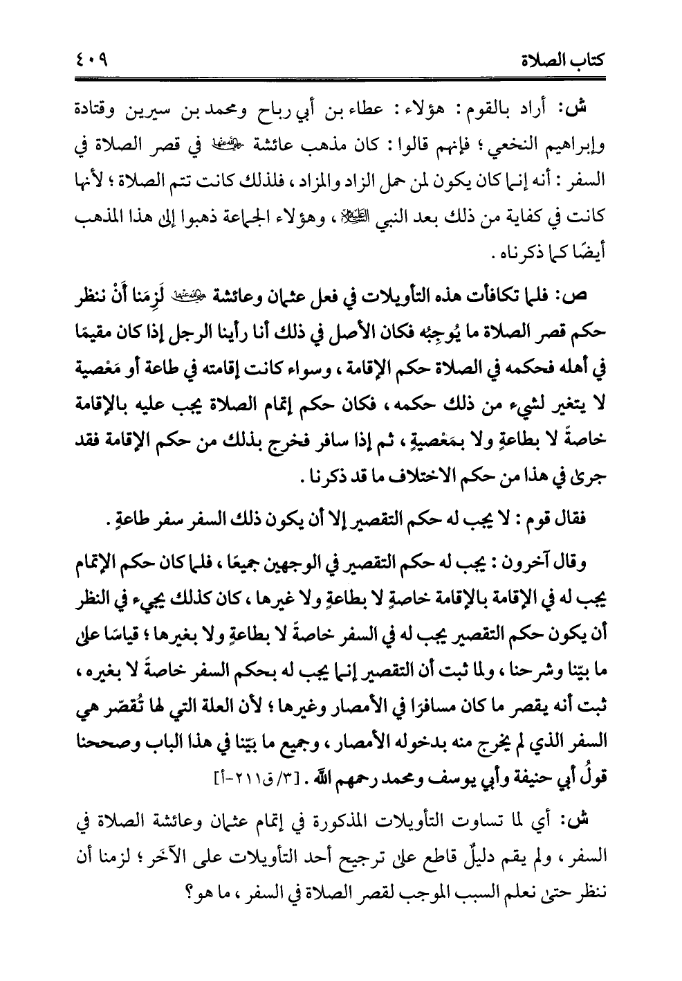 ش: أي لما تساوت التأويلات المذكورة في إتمام عثمان وعائشة الصلاة في السفر، ولم يقم دليلٌ قاطع على ترجيح أحد التأويلات على الآخَر؛ لزمنا أن ننظر حتى نعلم السبب الموجب لقصر الصلاة في السفر، ما هو؟
