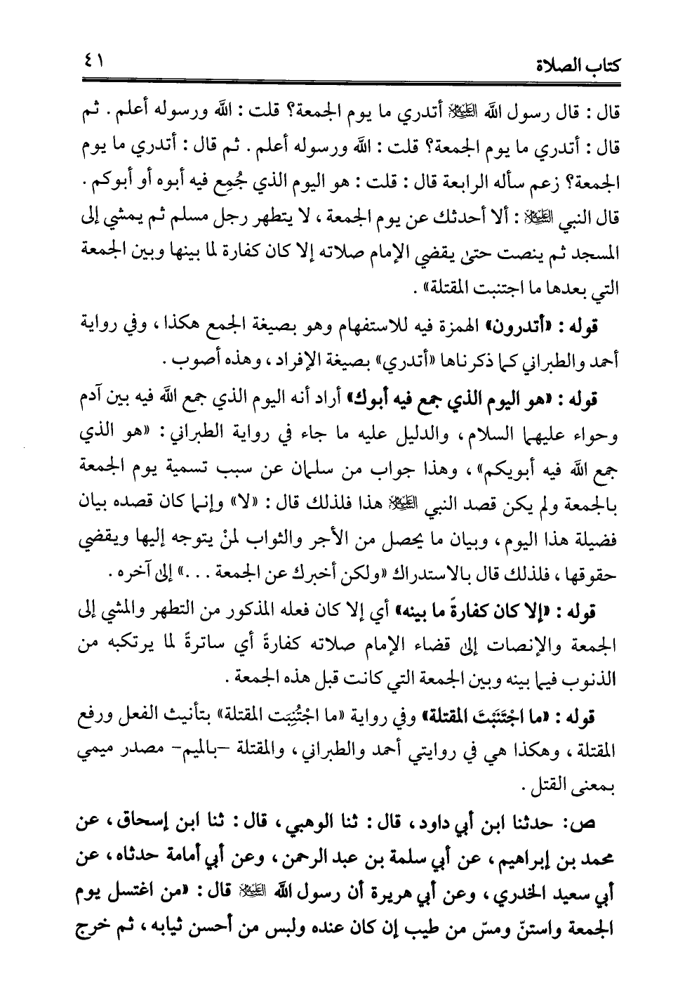 قال: قال رسول الله - عليه السلام - أتدري ما يوم الجمعة؟ قلت: الله ورسوله أعلم. ثم قال: أتدري ما يوم الجمعة؟ قلت: الله ورسوله أعلم. ثم قال: أتدري ما يوم الجمعة؟ زعم سأله الرابعة قال: قلت: هو اليوم الذي جُمِع فيه أبوه أو أبوكم. قال النبي - عليه السلام -: ألا أحدثك عن يوم الجمعة، لا يتطهر رجل مسلم ثم يمشي إلى المسجد ثم ينصت حتى يقضي الإِمام صلاته إلا كان كفارة لما بينها وبن الجمعة التي بعدها ما اجتنبت المقتلة".