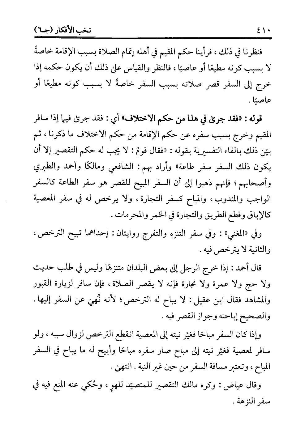 قوله: "فقد جرى في هذا من حكم الاختلاف" أي: فقد جرى فيما إذا سافر المقيم وخرج بسبب سفره عن حكم الإقامة من حكم الاختلاف ما ذكرنا، ثم بيّن ذلك بالفاء التفسيرية بقوله: "فقال قومٌ: لا يجب له حكم التقصير إلا أن يكون ذلك السفر سفر طاعة لما وأراد بهم: الشافعي ومالكًا وأحمد والطبري وأصحابهم؛ فإنهم ذهبوا إلى أن السفر المبيح للقصر هو سفر الطاعة كالسفر الواجب والمندوب، والمباح كسفر التجارة، ولا يرخص له في سفر المعصية كالإباق وقطع الطريق والتجارة في الخمر والمحرمات.
