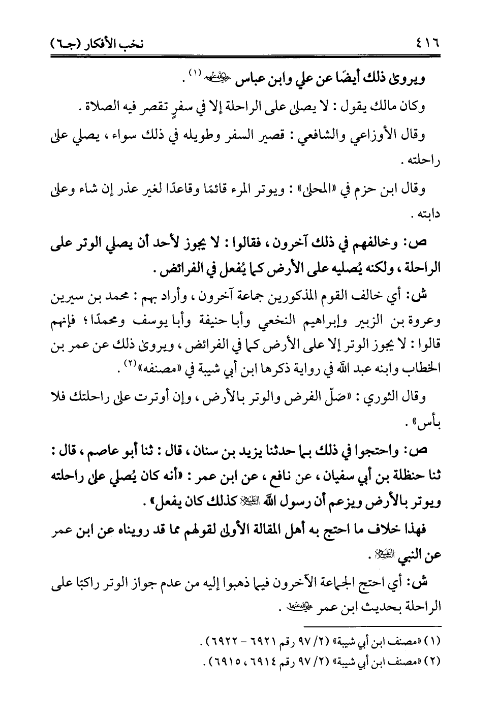 ش: أي خالف القوم المذكورين جماعة آخرون، وأراد بهم: محمد بن سيرين وعروة بن الزبير وإبراهيم النخعي وأبا حنيفة وأبا يوسف ومحمدًا فإنهم قالوا: لا يجوز الوتر إلا على الأرض كما في الفرائض، ويروى ذلك عن عمر بن الخطاب وابنه عبد الله في رواية ذكرها ابن أبي شيبة في "مصنفه" (¬2).