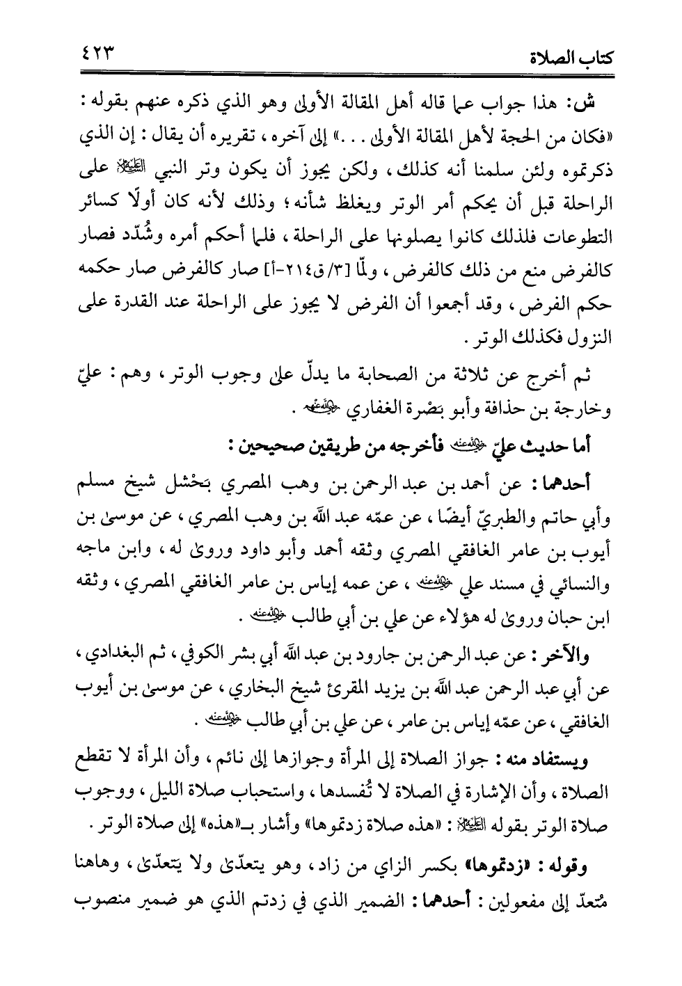 ثم أخرج عن ثلاثة من الصحابة ما يدلّ على وجوب الوتر، وهم: عليّ وخارجة بن حذافة وأبو بَصْرة الغفاري - رضي الله عنهم -.
