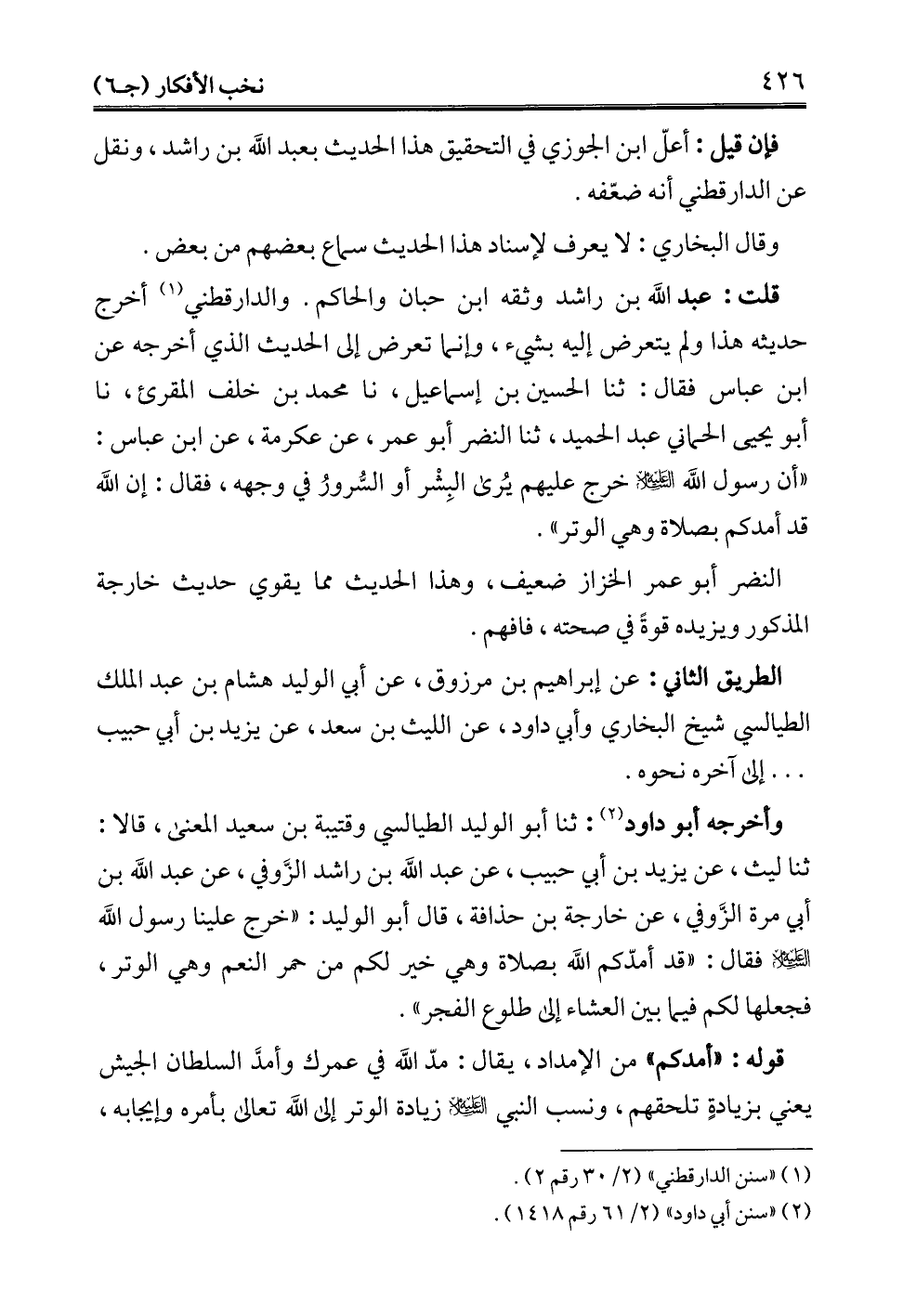 قلت: عبد الله بن راشد وثقه ابن حبان والحاكم. والدارقطني (¬1) أخرج حديثه هذا ولم يتعرض إليه بشيء، وإنما تعرض إلى الحديث الذي أخرجه عن ابن عباس فقال: ثنا الحسين بن إسماعيل، نا محمد بن خلف المقرئ، نا أبو يحيى الحماني عبد الحميد، ثنا النضر أبو عمر، عن عكرمة، عن ابن عباس: "أن رسول الله - عليه السلام - خرج عليهم يُرى البِشْر أو السُّرورُ في وجهه، فقال: إن الله قد أمدكم بصلاة وهي الوتر".