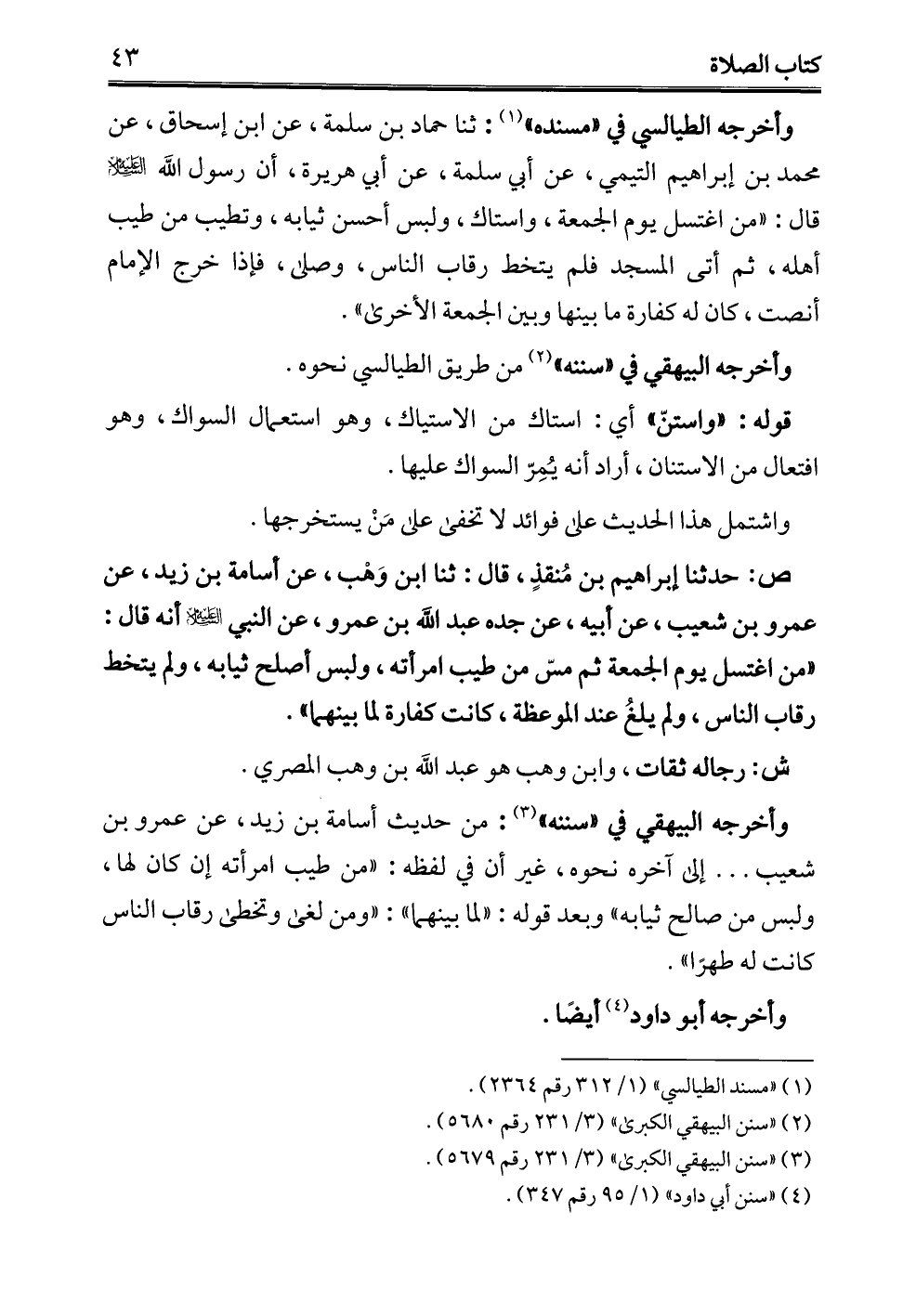 وأخرجه الطيالسي في "مسنده" (¬1): ثنا حماد بن سلمة، عن ابن إسحاق، عن محمَّد بن إبراهيم التيمي، عن أبي سلمة، عن أبي هريرة، أن رسول الله - عليه السلام - قال: "من اغتسل يوم الجمعة، واستاك، ولبس أحسن ثيابه، وتطيب من طيب أهله، ثم أتى المسجد فلم يتخط رقاب الناس، وصلى، فإذا خرج الإِمام أنصت، كان له كفارة ما بينها وبين الجمعة الأخرى".