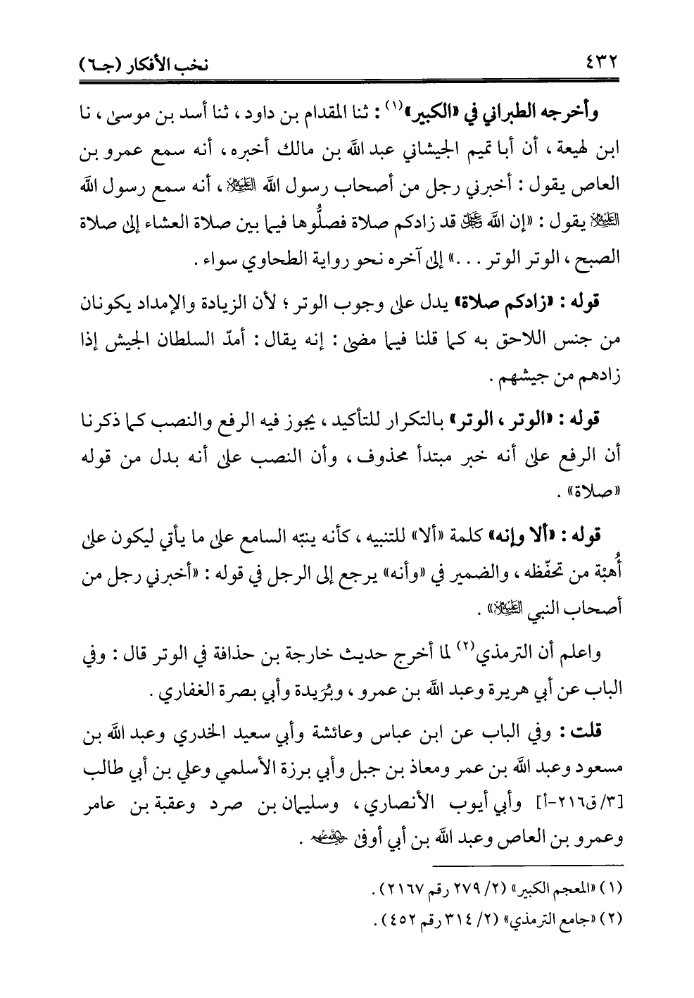 وأخرجه الطبراني في "الكبير" (¬1): ثنا المقدام بن داود، ثنا أسد بن موسى، نا ابن لهيعة، أن أبا تميم الجيشاني عبد الله بن مالك أخبره، أنه سمع عمرو بن العاص يقول: أخبرني رجل من أصحاب رسول الله - عليه السلام -، أنه سمع رسول الله - عليه السلام - يقول: "إن الله -عز وجل- قد زادكم صلاة فصلُّوها فيما بين صلاة العشاء إلى صلاة الصبح، الوتر الوتر ... " إلي آخره نحو رواية الطحاوي سواء.
