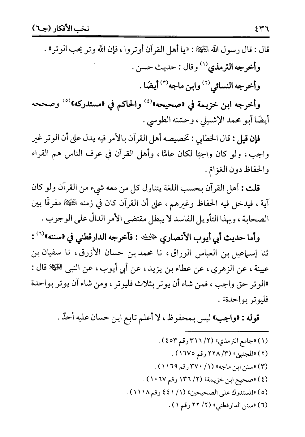 ثنا إسماعيل بن العباس الوراق، نا محمد بن حسان الأزرق، نا سفيان بن عيينة، عن الزهري، عن عطاء بن يزيد، عن أبي أيوب، عن النبي - عليه السلام - قال: "الوتر حق واجب، فمن شاء أن يوتر بثلاث فليوتر، ومن شاء أن يوتر بواحدة فليوتر بواحدة".