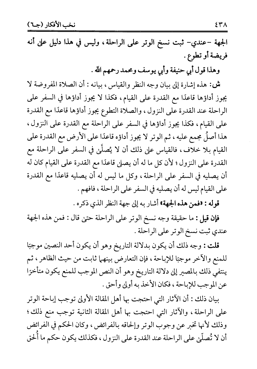 ش: هذه إشارة إلى بيان وجه النظر والقياس، بيانه: أنا الصلاة المفروضة لا يجوز أداؤها قاعدًا مع القدرة على القيام، فكذا لا يجوز أداؤها في السفر على الراحلة عند القدرة على النزول، والصلاة التطوع يجوز أداؤها قاعدًا مع القدرة على القيام، فكذا يجوز أداؤها في السفر على الراحلة مع القدرة على النزول، هذا أصلُ مجمع عليده، ثم الوتر لا يجوز أداؤه قاعدًا على الأرض مع القدرة على القيام بلا خلاف، فالقياس على ذلك أن لا يُصلَّي في السفر على الراحلة مع القدرة على النزول؛ لأن كل ما له أن يصل قاعدًا مع القدرة على القيام كان له أن يصليه في السفر على الراحلة، وكل ما ليس له أن يصليه قاعدًا مع القدرة على القيام ليس له أن يصليه في السفر على الراحلة، فافهم.