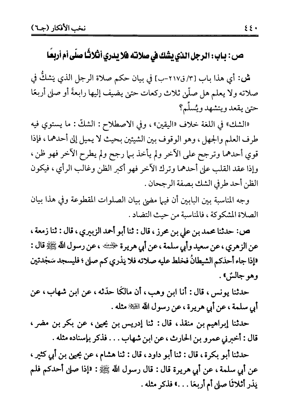 ش: أي هذا باب في بيان حكم صلاة الرجل الذي يَشكُّ في صلاته ولا يعلم هل صلّى ثلاث ركعات حتى يضيف إليها رابعةً أو صلى أربعًا حتى يقعد ويتشهد ويُسلِّم؟
