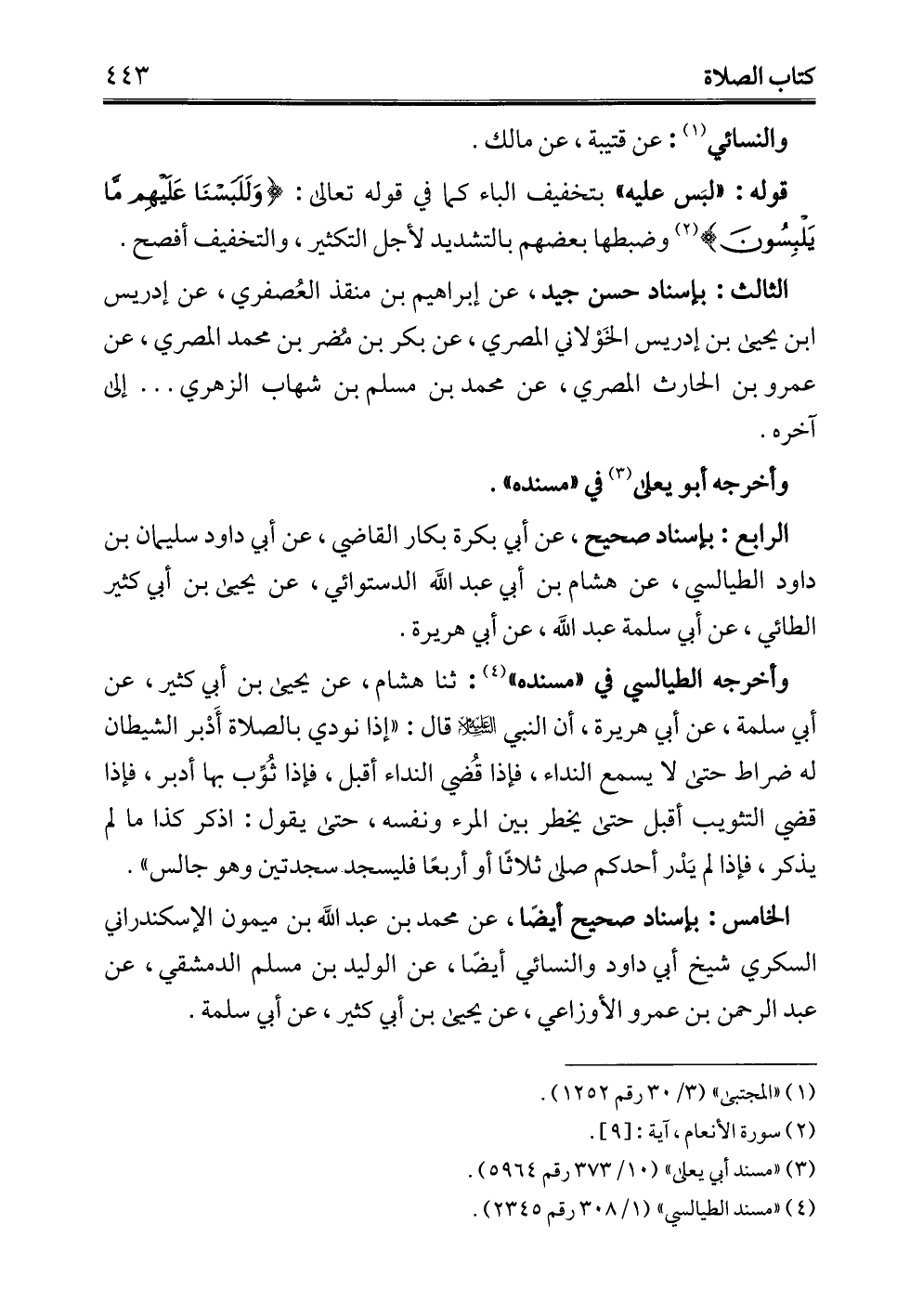 وأخرجه الطيالسي في "مسنده" (¬4): ثنا هشام، عن يحيى بن أبي كثير، عن أبي سلمة، عن أبي هريرة، أن النبي - عليه السلام - قال: "إذا نودي بالصلاة أَدْبر الشيطان له ضراط حتى لا يسمع النداء، فإذا قُضي النداء أقبل، فإذا ثُوِّب بها أدبر، فإذا قضي التثويب أقبل حتى يخطر بين المرء ونفسه، حتى يقول: اذكر كذا ما لم يذكر، فإذا لم يَدْر أحدكم صلى ثلاثًا أو أربعًا فليسجد سجدتن وهو جالس".