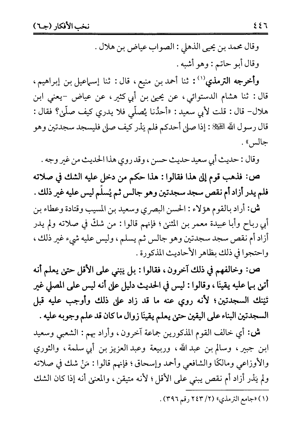 وأخرجه الترمذي (¬1): ثنا أحمد بن منيع، قال: ثنا إسماعيل بن إبراهيم، قال: ثنا هشام الدستوائي، عن يحيى بن أبي كثير، عن عياض -يعني ابن هلال- قال: قلت لأبي سعيد: "أحدُنا يُصلّي فلا يدري كيف صلّى؟ فقال: قال رسول الله - عليه السلام -: إذا صلى أحدكم فلم يَدْر كيف صلى فليسجد سجدتين وهو جالس".
