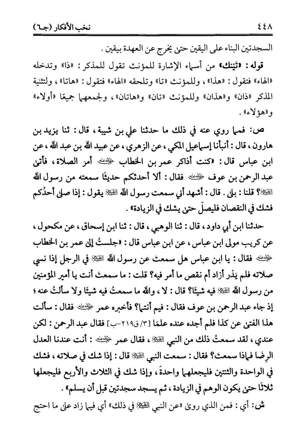 حدثنا ابن أبي داود، قال: ثنا الوهبي، قال: ثنا ابن إسحاق، عن مكحول، عن كريب مولى ابن عباس، عن ابن عباس قال: "جلست إلى عمر بن الخطاب فقال: يا ابن عباس هل سمعتَ عن رسول الله - عليه السلام - في الرجل إذا نسي صلاته فلم يَدْر أزاد أم نقص ما أمر فيه؟ قلت: ما سمعتَ أنت يا أمير المؤمنين من رسول الله - عليه السلام - فيه شيئًا؟ قال: لا، والله ما سمعتُ فيه شيئًا ولا سألتُ عنه؛ إذ جاء عبد الرحمن بن عوف فقال: فيم أنتما؟ فأخبره عمر - رضي الله عنه - فقال: سألت هذا الفتى عن كذا فلم أجده عنده علمًا فقال عبد الرحمن: لكن عندي، لقد سمعتُ ذلك من النبي - عليه السلام -، فقال عمر- رضي الله عنه -: أنت عندنا العدل الرِضَا فمإذا سمعتَ؟ فقال: سمعت النبي - عليه السلام - قال: إذا شك في صلاته، فشك في الواحدة والثنتين فليجعلهما واحدةً، وإذا شك في الثلاث والأربع فليجعلها ثلاثًا حتى يكون الوهم في الزيادة، ثم يسجد سجدتين قبل أن يسلم".