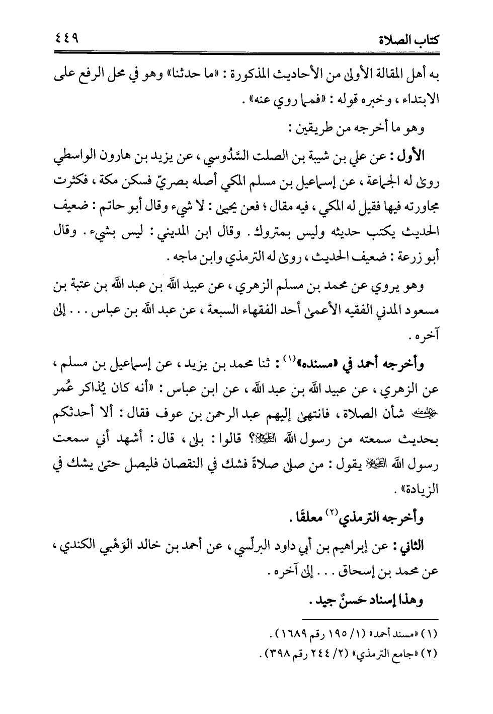 وأخرجه أحمد في "مسنده" (¬1): ثنا محمد بن يزيد، عن إسماعيل بن مسلم، عن الزهري، عن عبيد الله بن عبد الله، عن ابن عباس:"أنه كان يُذاكر عُمر - رضي الله عنه - شأن الصلاة، فانتهى إليهم عبد الرحمن بن عوف فقال: ألا أحدثكم بحديث سمعته من رسول الله - عليه السلام -؟ قالوا: بلى، قال: أشهد أني سمعت رسول الله - عليه السلام - يقول: من صلاةً فشك في النقصان فليصل حتى يشك في الزيادة".
