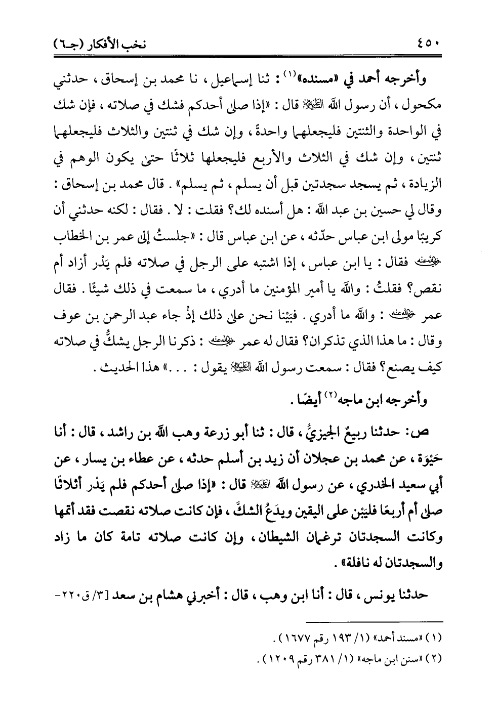 وأخرجه أحمد في "مسنده" (¬1): ثنا إسماعيل، نا محمد بن إسحاق، حدثني مكحول، أن رسول الله - عليه السلام - قال: "إذا صلى أحدكم فشك في صلاته، فإن شك في الواحدة والثنتين فليجعلهما واحدةً، وإن شك في ثنتين والثلاث فليجعلهما ثنتين، وإن شك في الثلاث والأربع فليجعلها ثلاثًا حتى يكون الوهم في الزيادة، ثم يسجد سجدتين قبل أن يسلم، ثم يسلم". قال محمد بن إسحاق: وقال لي حسين بن عبد الله: هل أسنده لك؟ فقلت: لا. فقال: لكنه حدثني أن كريبًا مولى ابن عباس حدّثه، عن ابن عباس قال: "جلستُ إلي عمر بن الخطاب - رضي الله عنه - فقال: يا ابن عباس، إذا اشتبه على الرجل في صلاته فلم يَدْر أزاد أم نقص؟ فقلتُ: والله يا أمير المؤمنين ما أدري، ما سمعت في ذلك شيئًا. فقال عمر - رضي الله عنه -: والله ما أدري. فبَيْنا نحن على ذلك إذْ جاء عبد الرحمن بن عوف وقال: ما هذا الذي تذكران؟ فقال له عمر- رضي الله عنه -: ذكرنا الرجل يشكُّ في صلاته كيف يصنع؟ فقال: سمعت رسول الله يقول: ... " هذا الحديث.