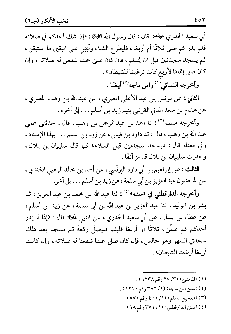 وأخرجه الدارقطني في "سننه" (¬4): ثنا عبد الله بن محمد بن عبد العزيز، ثنا بشر بن الوليد، ثنا عبد العزيز بن عبد الله بن أبي سلمة، عن زيد بن أسلم، عن عطاء بن يسار، عن أبي سعيد الخدري، عن النبي - عليه السلام - قال: "إذا لم يَدْر أحدكم كم صلّى، ثلاثًا أو أربعًا فليقم فليصلّ ركعةً ثم يسجد بعد ذلك سجدتي السهو وهو جالس، فإن كان صلى خمسًا شفعتا له صلاته، وإن كانت أربعًا أرغمتا الشيطان".