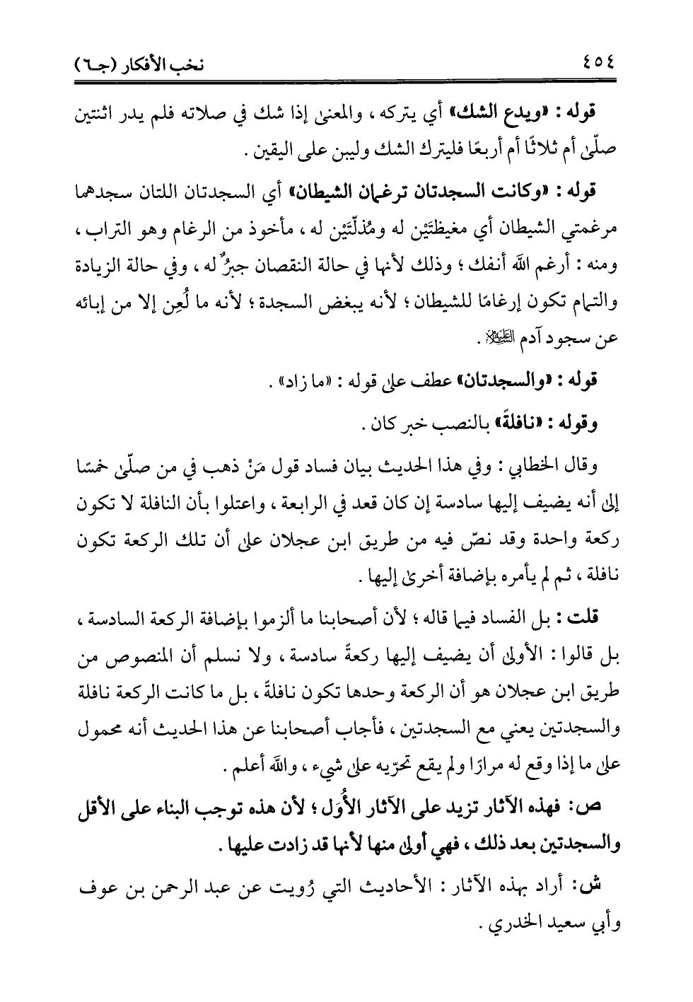 قلت: بل الفساد فيما قاله؛ لأن أصحابنا ما ألزموا بإضافة الركعة السادسة، بل قالوا: الأولى أن يضيف إليها ركعةً سادسة، ولا نسلم أن المنصوص من طريق ابن عجلان هو أن الركعة وحدها تكون نافلةً، بل ما كانت الركعة نافلة والسجدتين يعني مع السجدتين، فأجاب أصحابنا عن هذا الحديث أنه محمول على ما إذا وقع له مرارًا ولم يقع تحرّيه على شيء، والله أعلم.