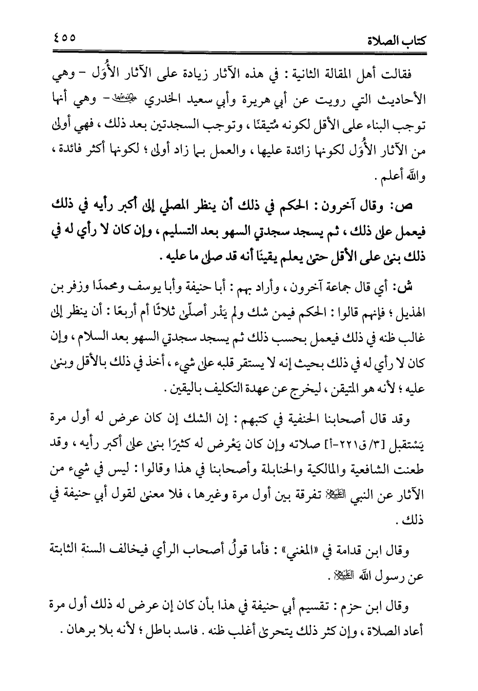 وقد قال أصحابنا الحنفية في كتبهم: إن الشك إن كان عرض له أول مرة يَسْتقبل صلاته وإن كان يَعْرض له كثيرًا بني على أكبر رأيه، وقد طعنت الشافعية والمالكية والحنابلة وأصحابنا في هذا وقالوا: ليس في شيء من الآثار عن النبي - عليه السلام - تفرقة بين أول مرة وغيرها، فلا معنى لقول أبي حنيفة في ذلك.