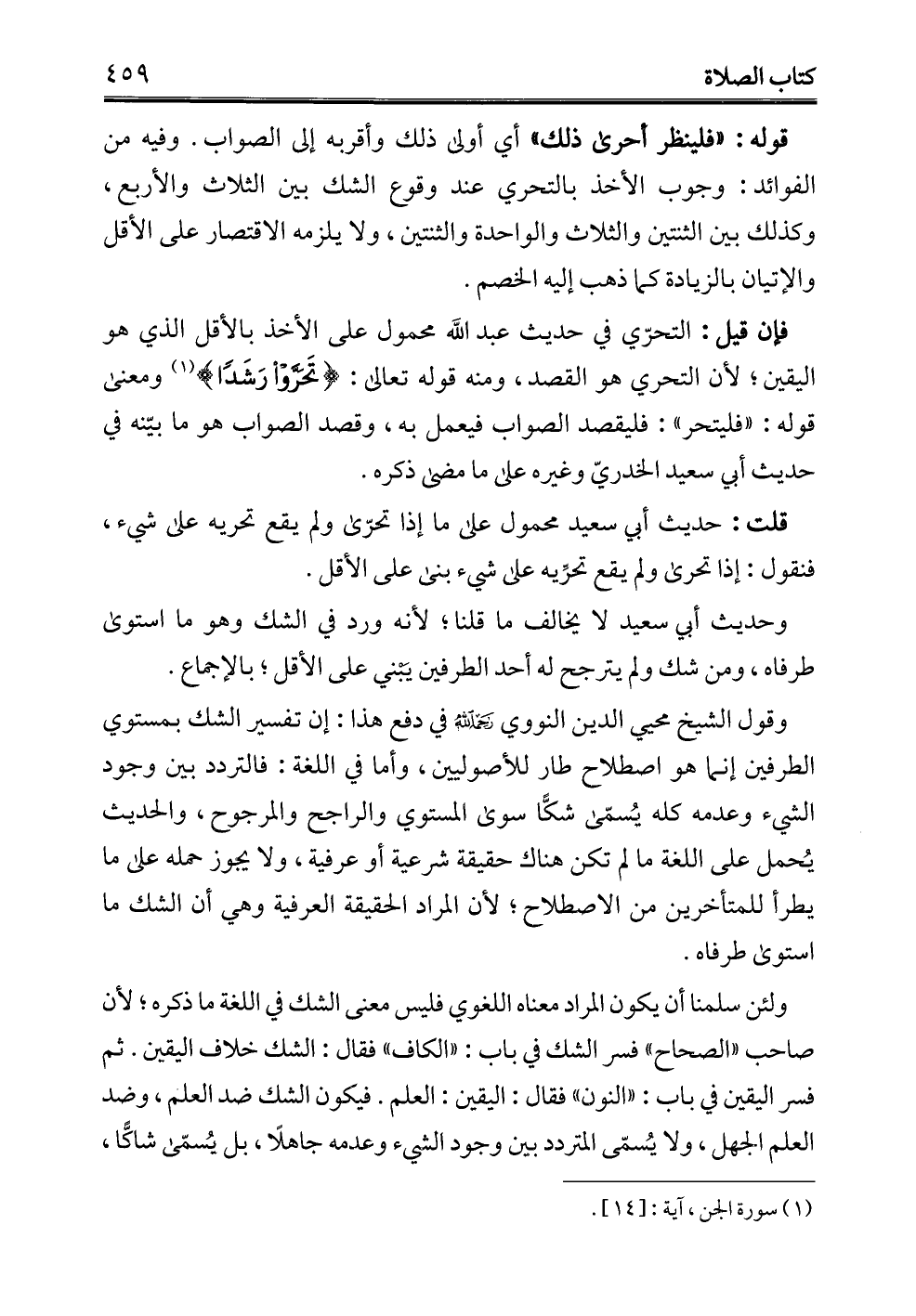 وقول الشيخ محيي الدين النووي -رحمه الله- في دفع هذا: إن تفسير الشك بمستوي الطرفين إنما هو اصطلاح طارئ للأصولين، وأما في اللغة: فالتردد بين وجود الشيء وعدمه كله يُسمّى شكًّا سوى المستوي والراجح والمرجوح، والحديث يُحمل على اللغة ما لم تكن هناك حقيقة شرعية أو عرفية، ولا يجوز حمله على ما يطرأ للمتأخرين من الاصطلاح؛ لأن المراد الحقيقة العرفية وهي أن الشك ما استوى طرفاه.