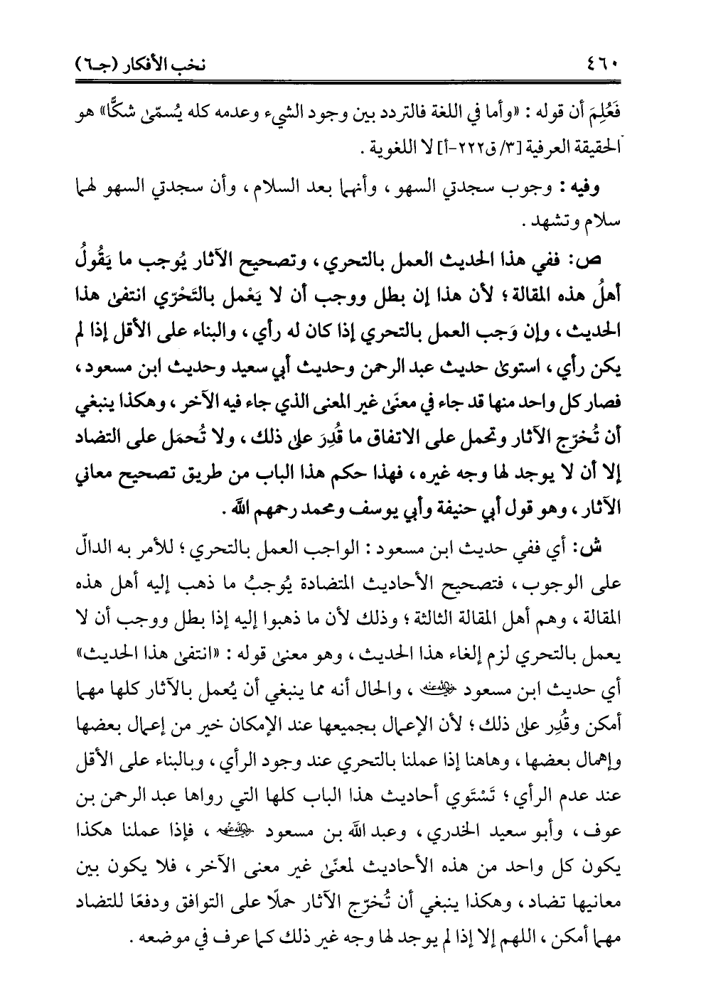 ص: ففي هذا الحديث العمل بالتحري، وتصحيح الآثار يُوجب ما يَقُولُ أهلُ هذه المقالة؛ لأن هذا إن بطل ووجب أن لا يَعْمل بالتَحْرّي انتفى هذا الحديث، وإن وَجب العمل بالتحري إذا كان له رأي، والبناء على الأقل إذا لم يكن رأي، استوى حديث عبد الرحمن وحديث أبي سعيد وحديث ابن مسعود، فصار كل واحد منها قد جاء في معنى غير المعنى الذي جاء فيه الآخر، وهكذا ينبغي أن تُخرّج الآثار وتحمل على الاتفاق ما قُدِرَ على ذلك، ولا تُحمَل على التضاد إلا أن لا يوجد لها وجه غيره، فهذا حكم هذا الباب من طريق تصحيح معاني الآثار، وهو قول أبي حنيفة وأبي يوسف ومحمد رحمهم الله.